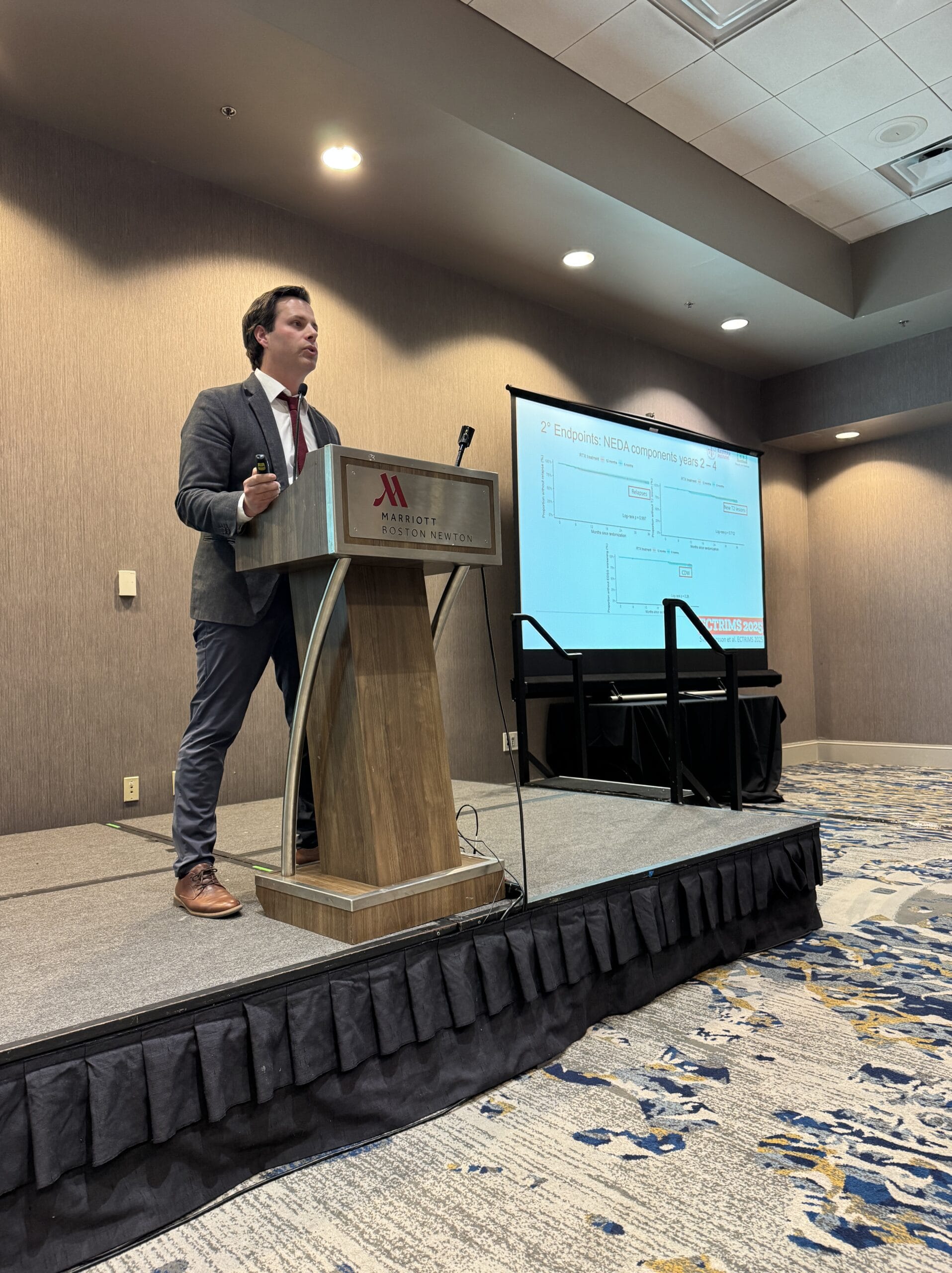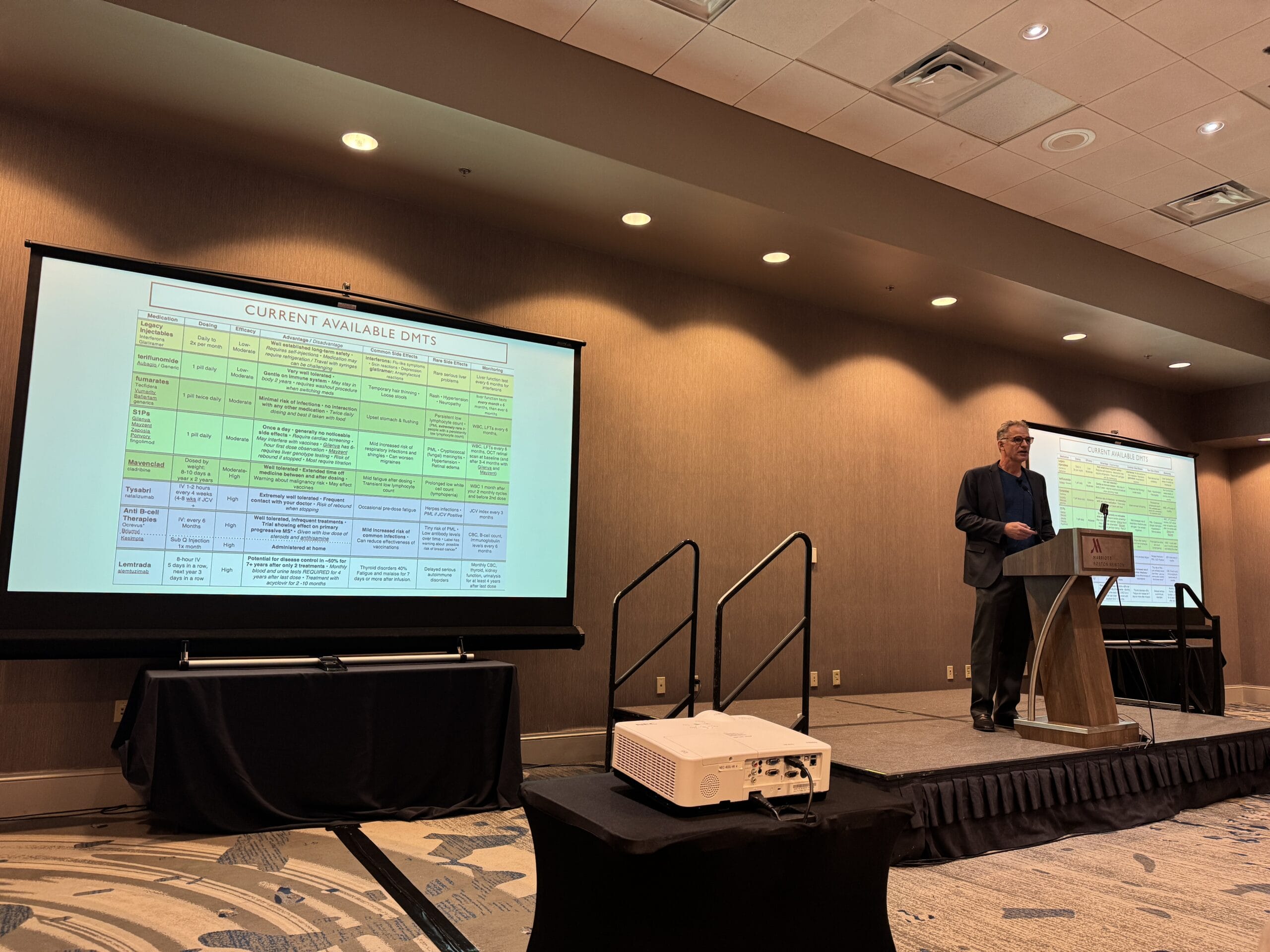 Then Dr. Andrew Bouley gave an exceptionally clear and detailed presentation on aging and MS. He walked us through landmark studies like DISCOMS and DOT-MS, which explored when, if ever, it might be safe to stop or de-escalate disease-modifying therapy. His take-home message: while stability is reassuring, decisions about treatment changes must be individualized and guided by science. His balanced, evidence-based explanations made complex data easy to follow.